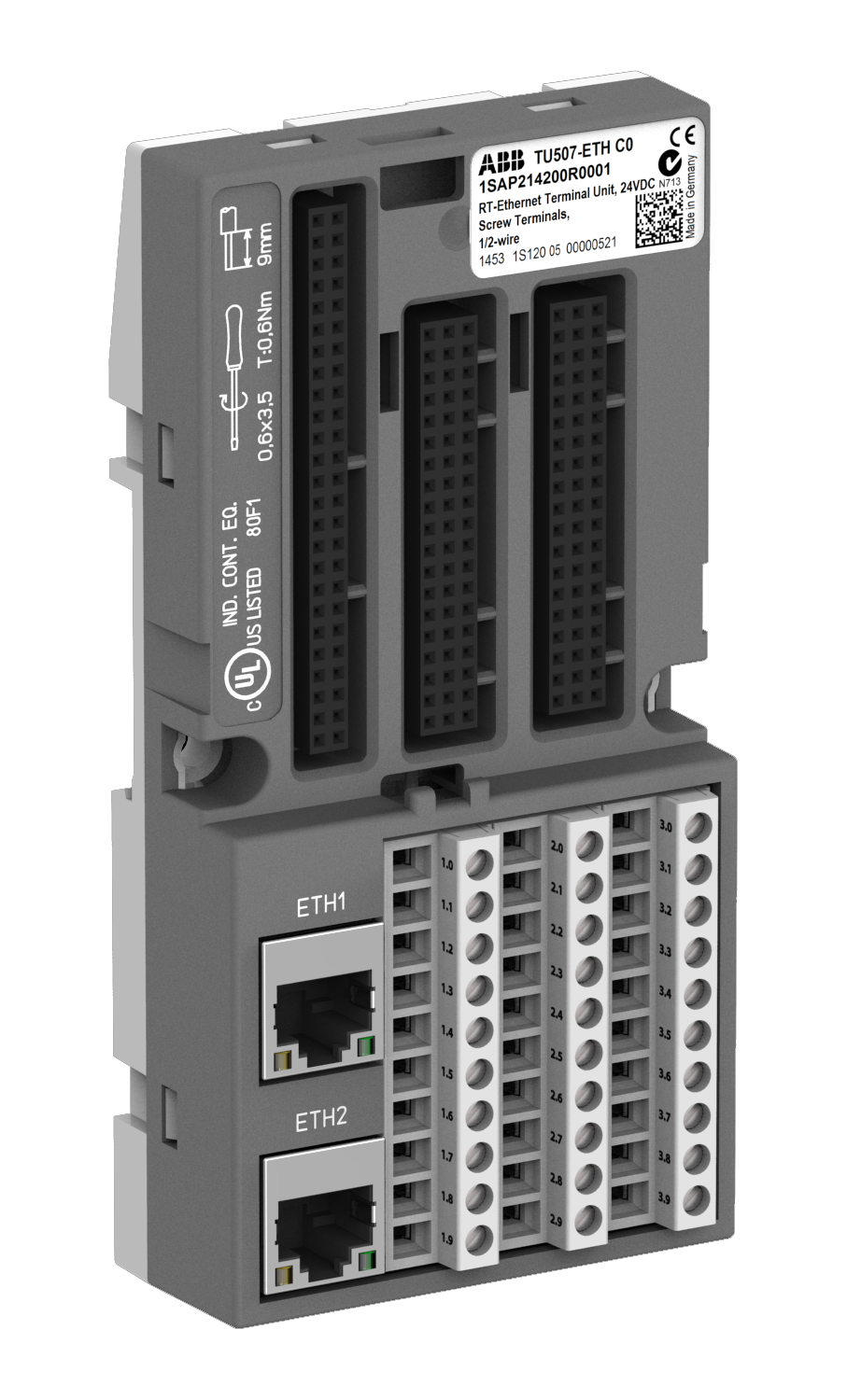 ABB TU507-ETH: S500 Interface terminal unit. For Ethernet protocols. Screw terminals. 2 RJ45 connectors.