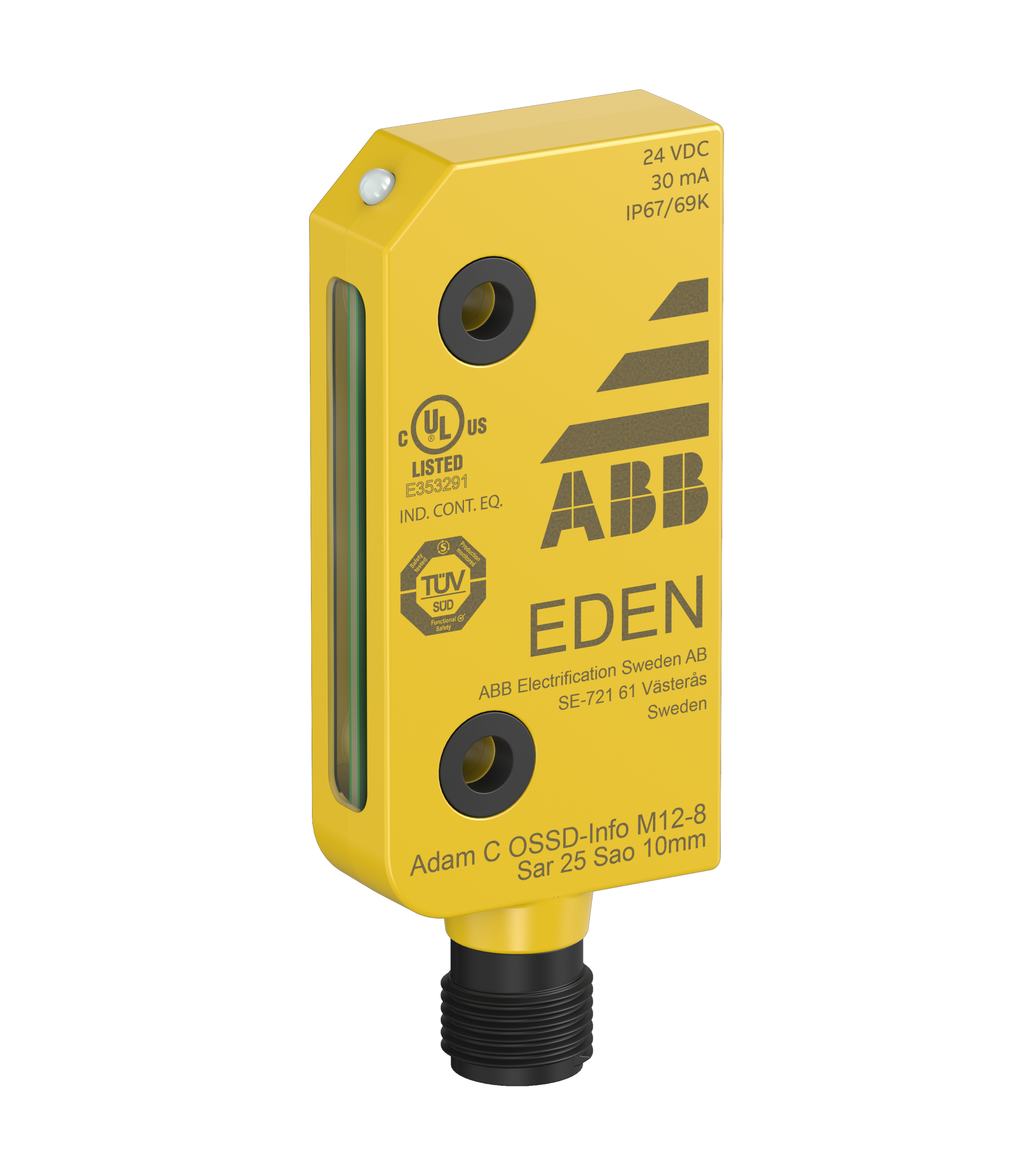 Adam safety sensor unit with OSSD signals and information output. M12-8 male connector, IP69K, yellow. 4pcs of DA 1B distance plates and 4pcs of DA 2B distance rings are included. Coated PCBA for extra protection in harsh environments.