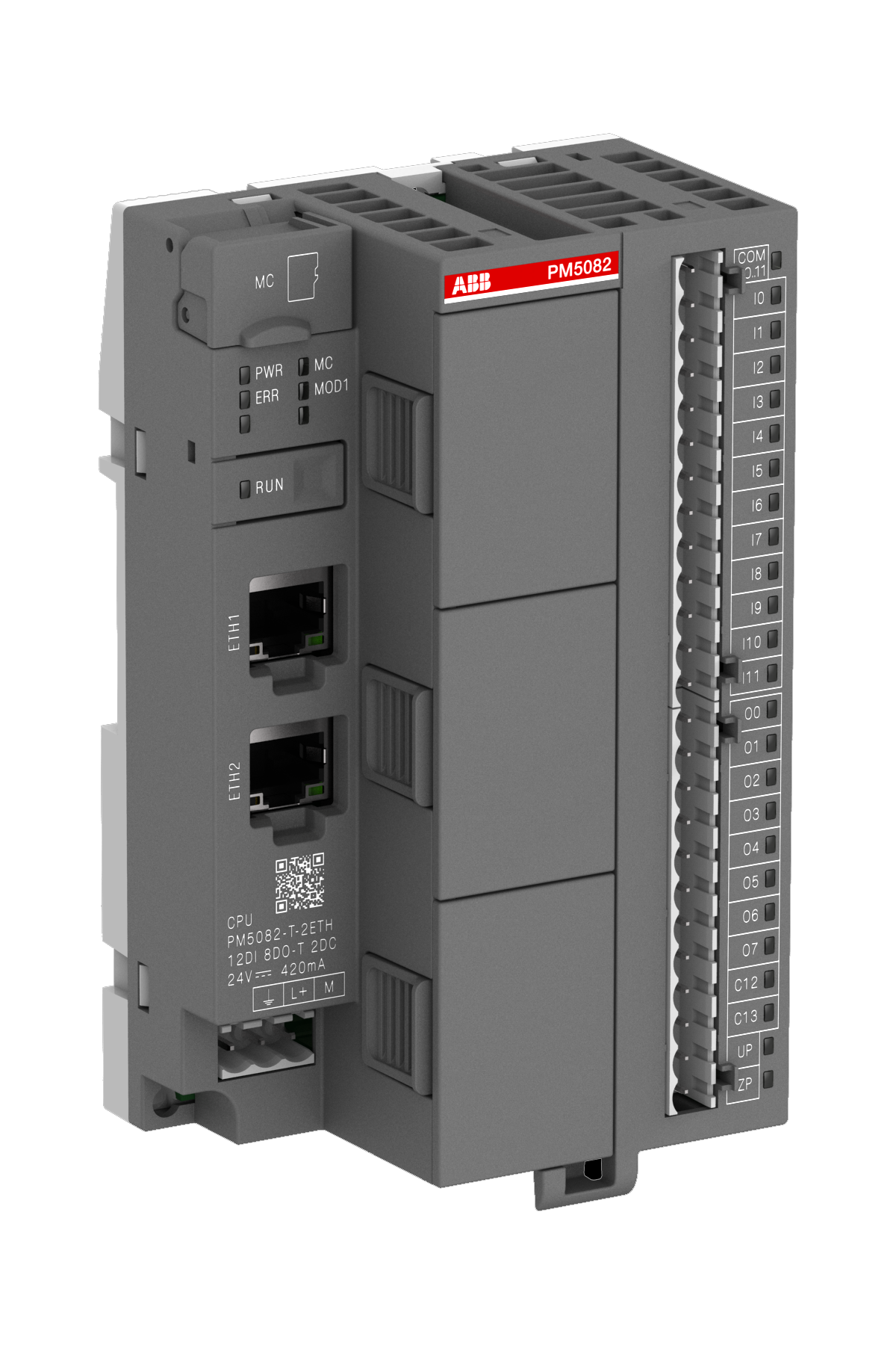 ABB PM5082-T-2ETH: AC500-eCo CPU Processor module. Memory 8MB. 12 DI 24VDC. 8 DO 24VDC 0.5A. 2 DC 24VDC. 2 Ethernet interfaces. 3 option slots.